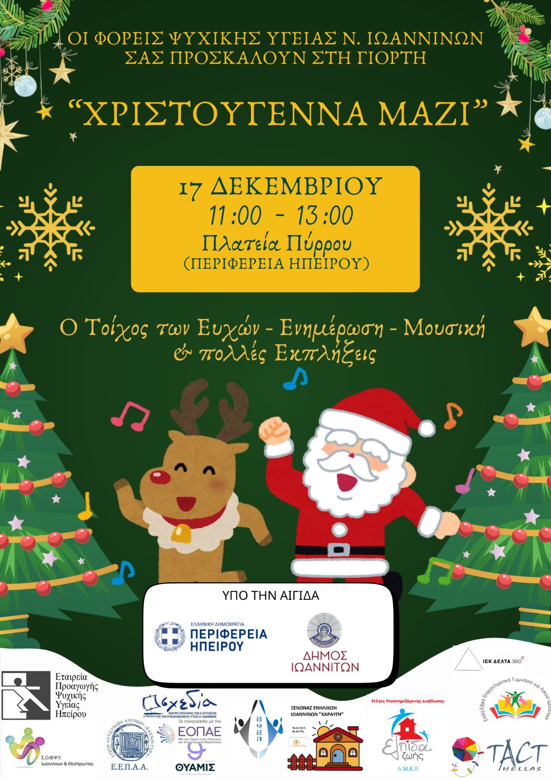 Με τραγούδια, χρώματα, χαμόγελα και μηνύματα αγάπης γέμισε ο χώρος μπροστά από το κτίριο της Περιφέρειας Ηπείρου, όπου οι φορείς ψυχικής υγείας του Νομού Ιωαννίνων ένωσαν για τρίτη συνεχόμενη χρονιά τις δυνάμεις τους σε μια κοινή χριστουγεννιάτικη δράση.