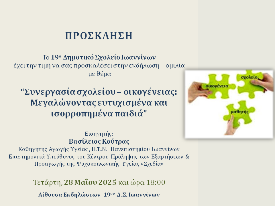 Διαβάστε περισσότερα »Εκδήλωση – ομιλία με θέμα «Συνεργασία σχολείου – οικογένειας: Μεγαλώνοντας ευτυχισμένα και ισορροπημένα παιδιά» οργανώνει το 19ο Δημοτικό Σχολείο Ιωαννίνων,...